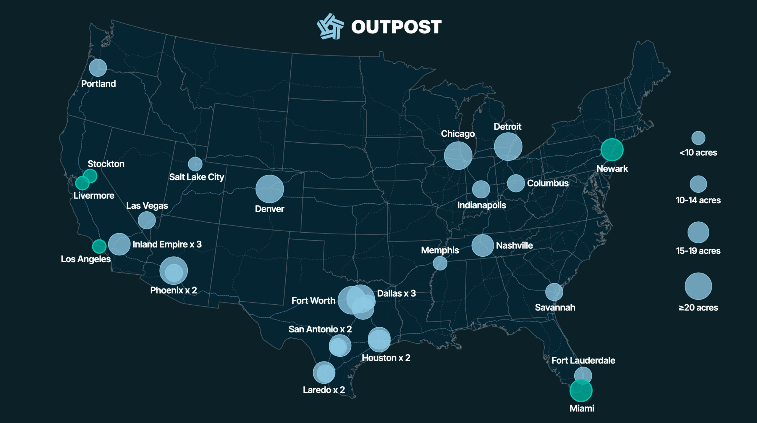 - Livermore: A 2.75-acre site at 461 McGraw Ave along I-580, linking the Port of Oakland with San Joaquin Valley distribution centers and intermodal facilities. Information at outpost.us/livermore.